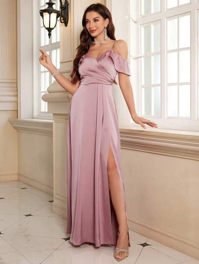Vestidos de fiesta sólidos con hombros descubiertos y abertura en el muslo para mujeres - Rosa vieja - Añade 4