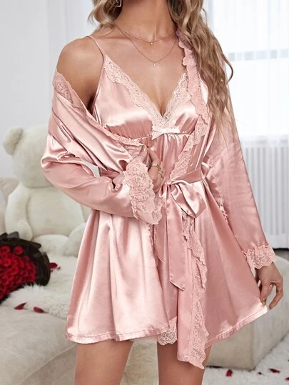 Conjunto de pijama Bata con encaje en contraste con cinturón de satén & Vestido de tirantes con lazo delantero - Rosa - Añade 3
