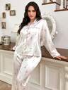 CottageSlumber Conjunto de camisa de manga larga con cuello y pantalones con estampado floral de tinta, blanco. Temporada de vacaciones, esplendor floral abundante, detalles acogedores y elegantes