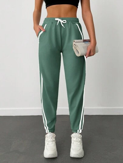 EURMUSE Pantalón de chándal con cordón en la cintura y costuras laterales de contraste, 95% algodón - Verde - Añade 2