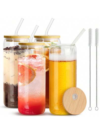 4 Piezas Vasos de Cristal de 20 onzas, Juego de Vasos de Vidrio con Tapa Ideales para Whisky, Cafe, Cerveza, Capuchino, Incluye 4 Popotes de Vidrio 2 Cepillos de Paja - transparente - Añade 1