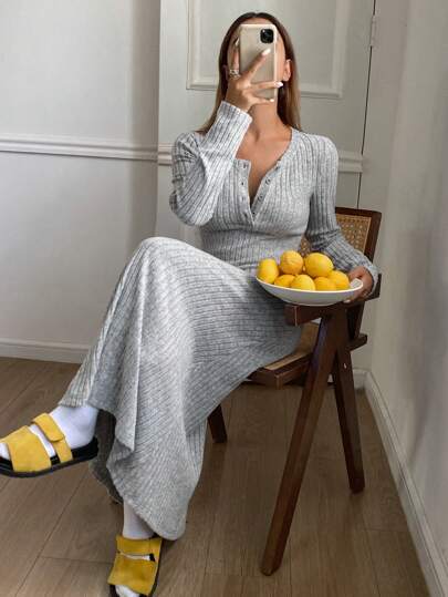 DAZY Vestido casual ajustado de tela de punto acanalada, pijama de otoño, invierno - Gris - Añade 1