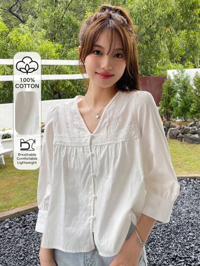 DAZY Blusa Con Botones Frontales, Manga Abullonada Y Detalle De Encaje - Blanco - Añade 5