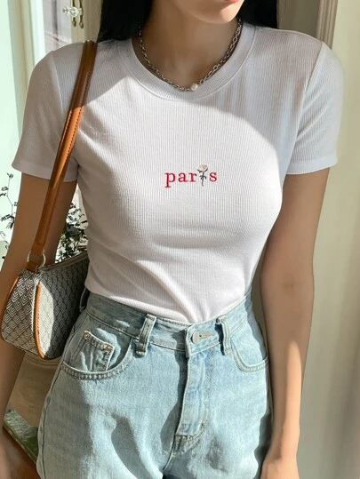 DAZY Camiseta De Punto Acanalado Con Bordado Floral Y De Letras - Blanco - Añade 8