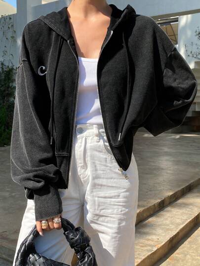 DAZY Chaqueta con capucha oversize con parche bordado de letras para mujer, ropa de otoño - Gris Oscuro - Añade 1