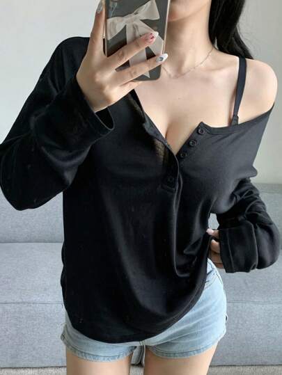 DAZY Camiseta oversize con botones delanteros y hombros caídos, para primavera, verano y otoño. Tops de manga larga de estilo preppy para mujer - Negro - Añade 5