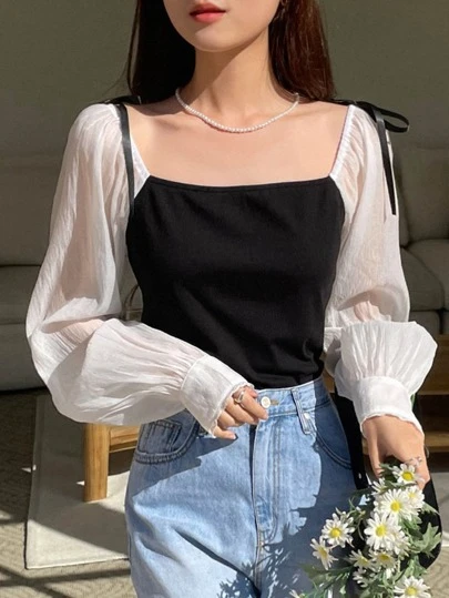 DAZY Blusa de dos tonos con cuello cuadrado y mangas farol 2 en 1, con volantes, ropa de vuelta al colegio, ropa de mujer de otoño con manga larga - Blanco y Negro - Añade 1