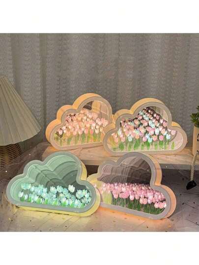 Luz nocturna de tulipán en forma de nube hecha a mano, lámpara de atmósfera de flor de espejo y océano, decoración de escritorio, regalo creativo - Multicolor - Añade 4