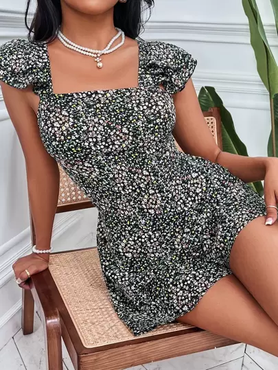 Mono floral de cuello cuadrado ribete con fruncido de espalda abierta con nudo - Negro - Añade 1