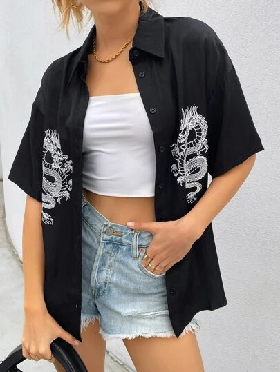 Camisa con estampado de dragón con botón - Negro - Añade 5