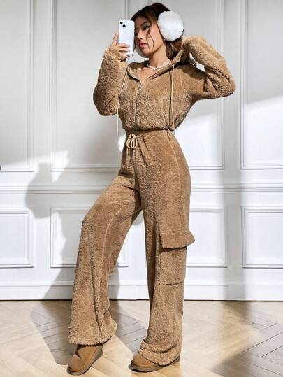 SHEIN EZwear Capucha de hombros caídos con cordón & Pantalones con bolsillo con solapa - Caqui - Añade 1