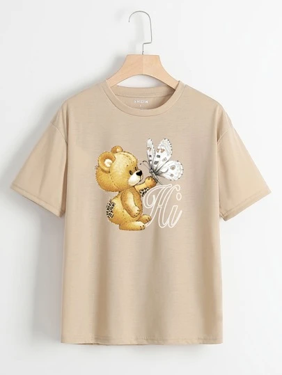Camiseta con estampado de letra y dibujos animados de hombros caídos - Caqui - Añade 4