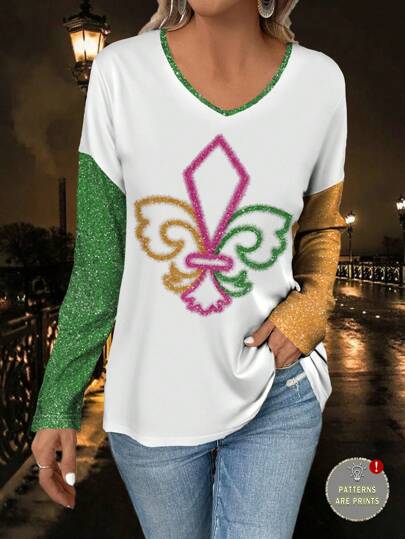 EMERY ROSE Camiseta de cuello en V con hombros caídos, estampado de bloques de color, flores geométricas y lentejuelas, adecuada para fiestas y reuniones, primavera/verano - Multicolor - Añade 3