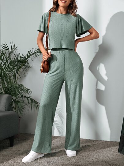 SHEIN LUNE Camiseta crop con bordado con ojal de manga mariposa con pantalones - Verde - Añade 2