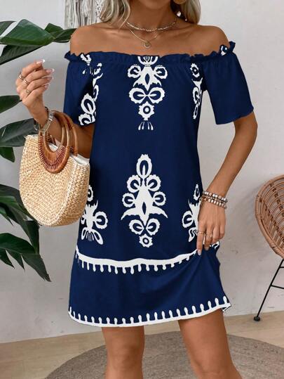 EMERY ROSE Vestido de estilo vintage para mujer con diseño impreso y hombros descubiertos, simple y adecuado para uso diario - Azul Marino - Añade 7