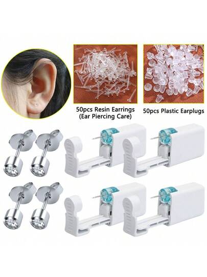 Kit de perforación de orejas con 4 piezas de pistola de perforación de orejas desechable con aretes incorporados, 50 piezas de aretes de plástico para infección de oídos - Multicolor - Añade 1