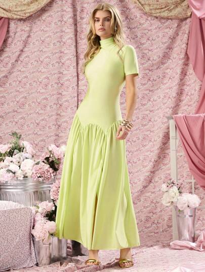 COSMINA Elegante vestido de fiesta largo para mujer de cuello alto, unicolor, fruncido y con abertura, para cóctel y gala de otoño - Verde - Añade 5