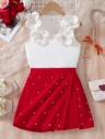 Elladie kids Conjunto de 2 piezas de estilo elegante francés para niñas jóvenes, compuesto por una blusa blanca con cuello de volantes y un lazo 3D burdeos, combinada con una falda-pantalón burdeos con cuentas, adecuado para uso diario, fiesta, casual, primavera/otoño, invierno, Navidad