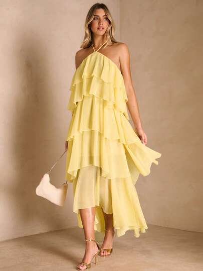 Enchnt Vestido elegante y sexy con volantes en la espalda y el bajo, estilo de resort de playa - Amarillo - Añade 1