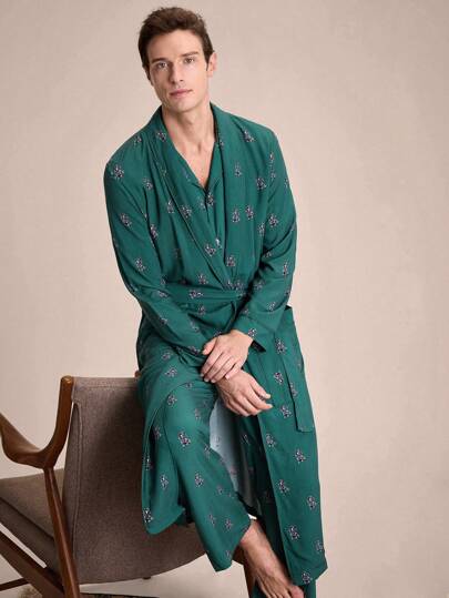 EverLounge Bata larga casual con cuello con muesca y bolsillo con estampado completo para hombre - Verde - Añade 1