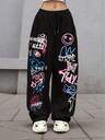 Pantalones anchos de pierna ancha con cordón y estampado de garabatos casuales para mujer de talla grande