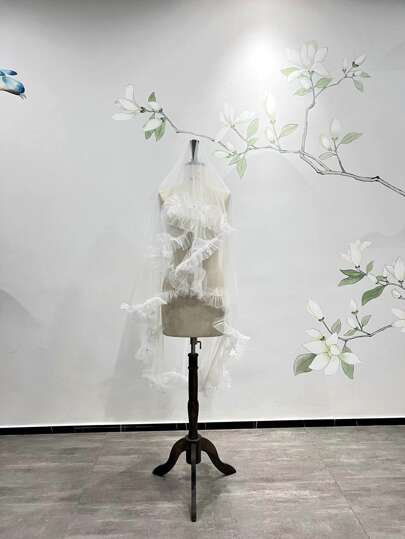 Velo nupcial con adorno de volantes y perlas falsas, ropa de otoño para mujeres - Blanco - Añade 1
