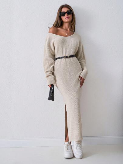SHEIN Tall Vestido midi de punto ajustado con hombros descubiertos y bajo asimétrico - Albaricoque - Añade 6