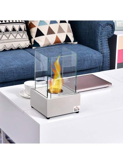 HOMCOM Chimenea de Bioetanol de Sobremesa con Quemador de 0,4 L, Biochimenea de Acero y Cristal para Interior y Exterior, 20x20x33cm, Plata - Plateado - Añade 8