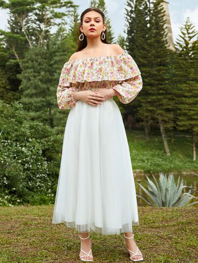 SHEIN X BEEBA Blusa con estampado floral de hombros descubiertos ribete con fruncido de manga farol - Multicolor - Añade 6