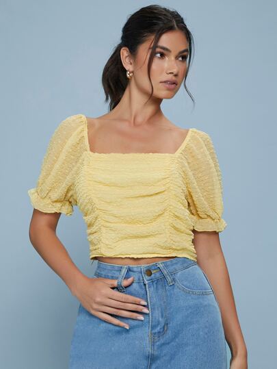 SHEIN Top Corto Con Manga Acampanada Y Fruncido - Amarillo - Añade 2