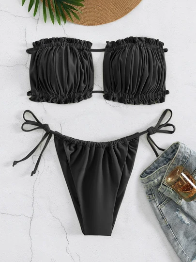 ribete fruncido Bandeau con cordón lateral Bañador bikini - Negro - Añade 1
