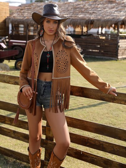 RELISH NOLESS Chaqueta con flecos estilo cowgirl bohemio hippie bohemio vintage para mujer - Marrón - Añade 7