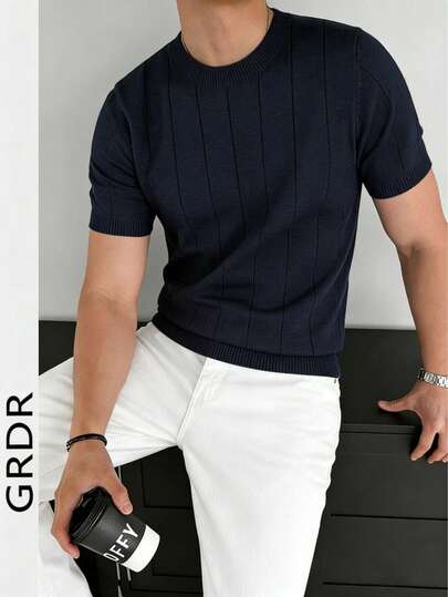 GRDR Camiseta de manga corta de punto acanalado versátil y sencilla de cuello redondo para hombre - Uso diario casual - Azul Marino - Añade 1