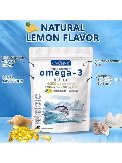 Gwynne Super Omega 3 Premium Limón Aceite De Pescado 4200mg,epa,dha Y Omega 3 Supplement,salud Del Corazón,salud Cerebral, Reducción Del Estrés,apoyo A La Salud Del Colesterol,120 Cápsulas - Otros - Añade 4