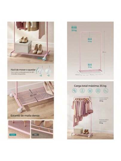 Perchero Burro con Ruedas, Perchero de Ropa, 40.5x 74x 158, Estante de Malla Densa, 2 Frenos, Marco de Acero, Blanco MHSR130W01 - Rosa Jalea + 74W cm - Añade 4