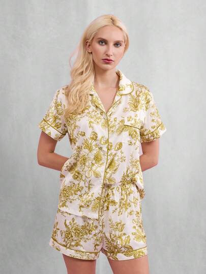 TryMe Conjunto de pijama de satén con botones, manga corta y cuello solapa con estampado de jardín - Verde - Añade 7