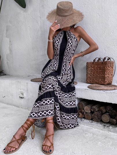 Vestido de tirantes con estampado geométrico con tira cruzada de espalda abierta - Multicolor - Añade 1