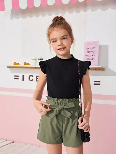 SHEIN Conjunto de blusa con ribete de volantes para niña preadolescente y pantalones cortos con cintura fruncida y cinturón - Multicolor - Añade 1