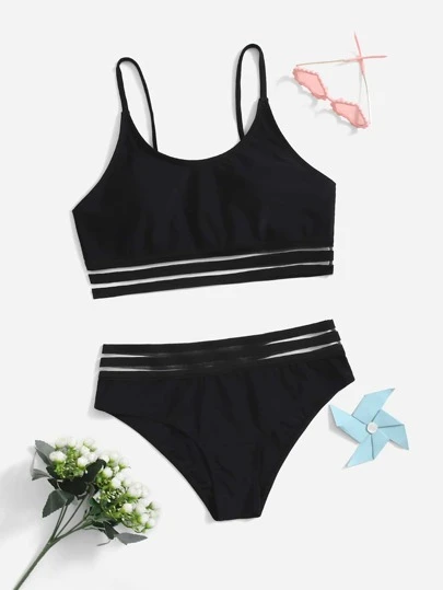 Conjunto de bikini sólido con contraste de malla para niña preadolescente, playa de verano - Negro - Añade 1