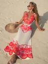 Falda maxi bohemia con cuello en V y espalda descubierta, con estampado floral rojo y tela elástica