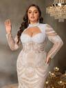 Faeriesty Vestido de gala de talla grande glamoroso y lujoso en color champán con cuentas, motivos de olas fluidas y escamas - Sobrecapa de tul transparente, cuello redondo y mangas dolman para galas y bodas de alta gama