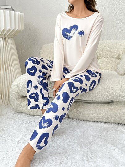 Conjunto de pijama pantalones con camiseta con estampado de corazón - Azul y blanco - Añade 1