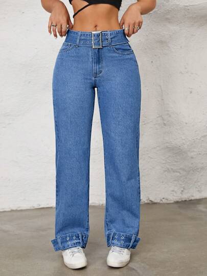 SHEIN ICON Jeans Rectos De Talle Alto Con Cinturón - Azul lavado medio - Añade 5