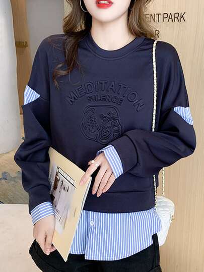 Pullover con estampado de letra de hombros caídos 2 en 1 - Azul Marino - Añade 4
