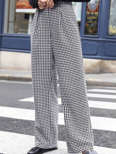 SHEIN Frenchy Pantalones con estampado de pata de gallo de pierna recta tweed - Blanco y Negro - Añade 5