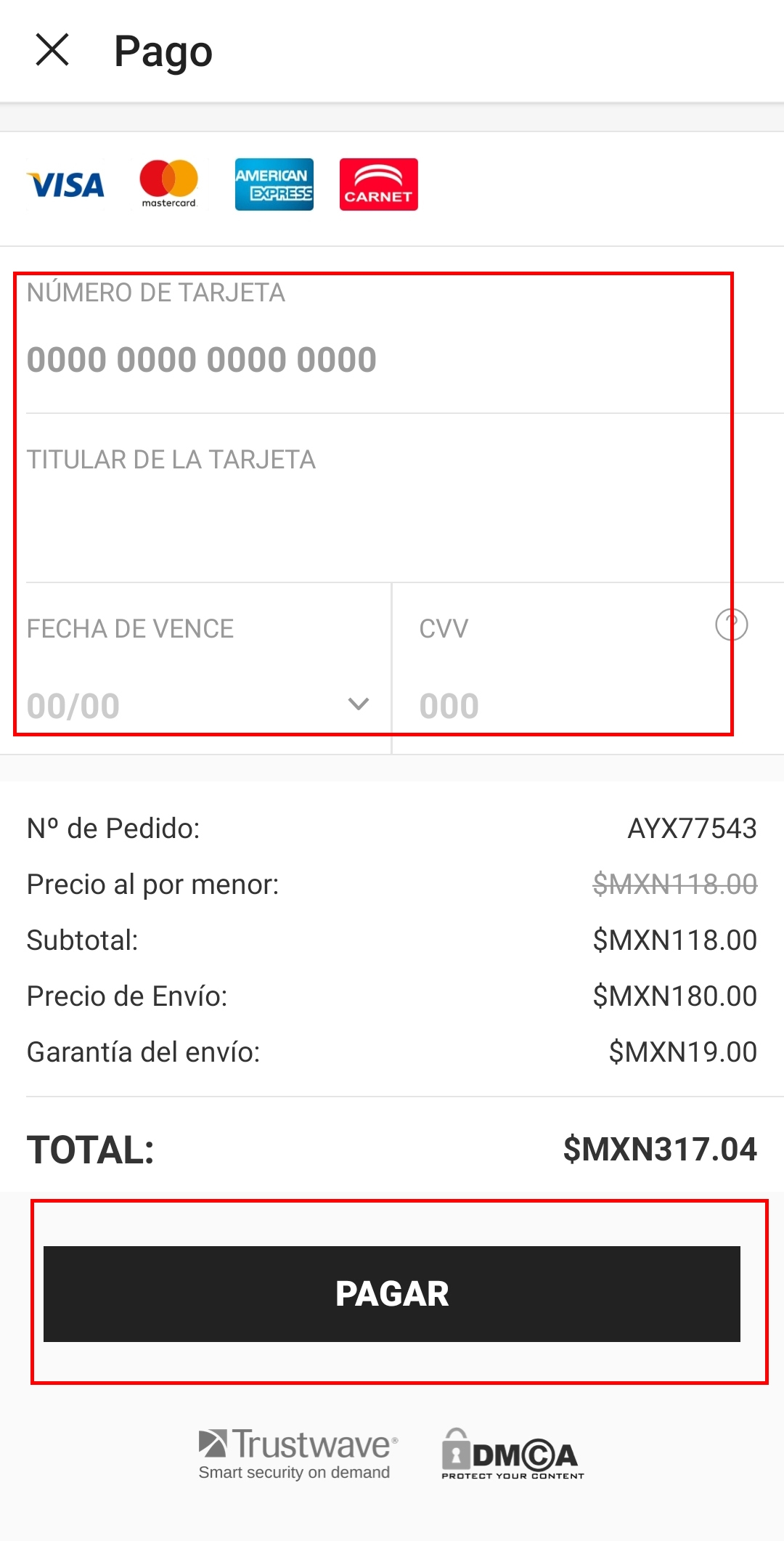 Rellene la información de pago y luego haga click en el botón PAGAR para completar la compra.