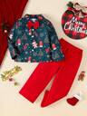 Conjunto de 2 piezas de camisa de manga larga con corbata de moño y estampado navideño + pantalones rectos de unicolor para niños pequeños en otoño/invierno