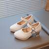 1 par de zapatos de cuero con tacón grueso y decoración de perlas, estilo retro de escote bajo, adecuados para bodas y fiestas, para niños