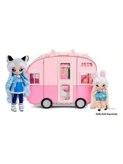 Na! Na! Na! Surprise Caravana Kitty Cat Rosa Sin Muñecas, Con 7 ÁREAS DE JUEGO - Cocina, cama, ducha, hamaca, armario, toldo y comedor. La caravana Kitty-Cat es como un grande gato rosa con orejas y cola de gatito y matrícula MEOW. Hay muchos detalles impresos en todas partes, como papel pintado de conejito y azulejos de animales. - Rosa - Añade 4