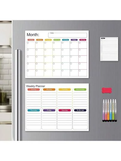 ZZBIFRJ Calendario Magnético para Refrigerador Juego de 3 Piezas, Planeador Mensual Reutilizable Viene con 6 Marcadores Magnéticos y Un Borrador Magnético - negro - Añade 5